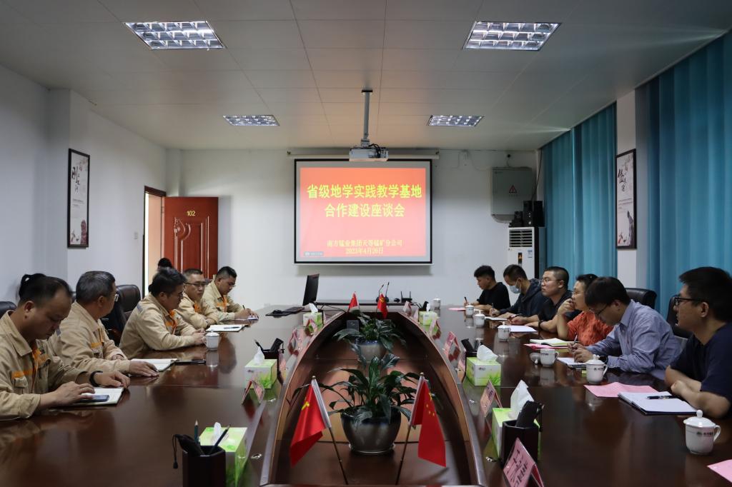 2022年我院承担了广西自然资源厅出资委托的《广西综合野外实习基地选址及矿产勘查虚拟仿真实验教学平台建设》,该项目拟建设省级地学实践教学基地一处。为顺利完成区厅项目任务,扎实推进工作进程, 进一步加强学院学生培育培养建设,强化学院学科内涵,促进自然资源系统人才的高质量发展,4月26日,自然资源工程系周宁、刘鹏飞等一行前往南方锰业集团有限责任公司天等锰矿分公司,开展访企拓岗及学院野外综合实习基地建设的合作座谈,并前往矿山采矿区、排土场和尾矿库等场地进行实地调研。