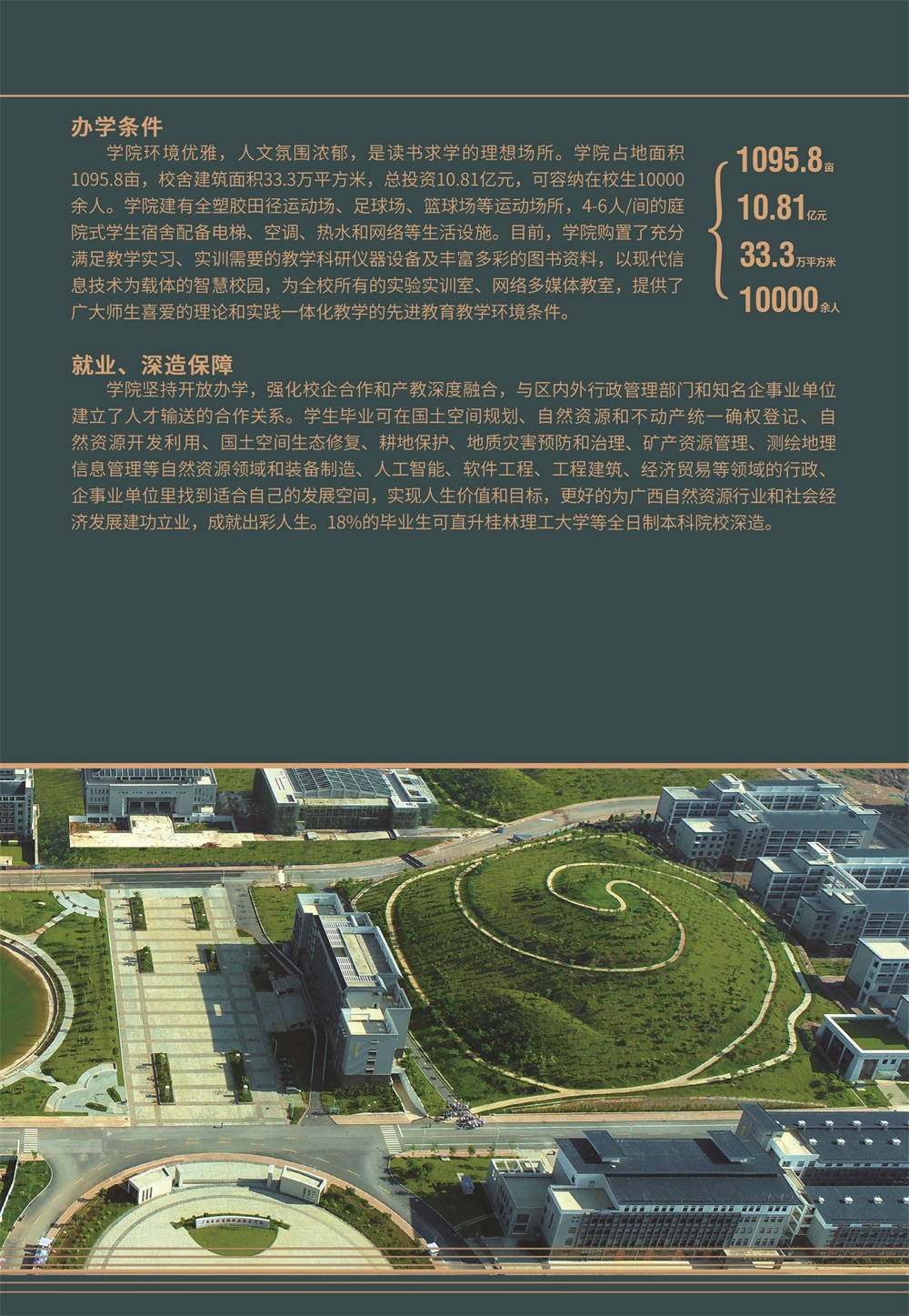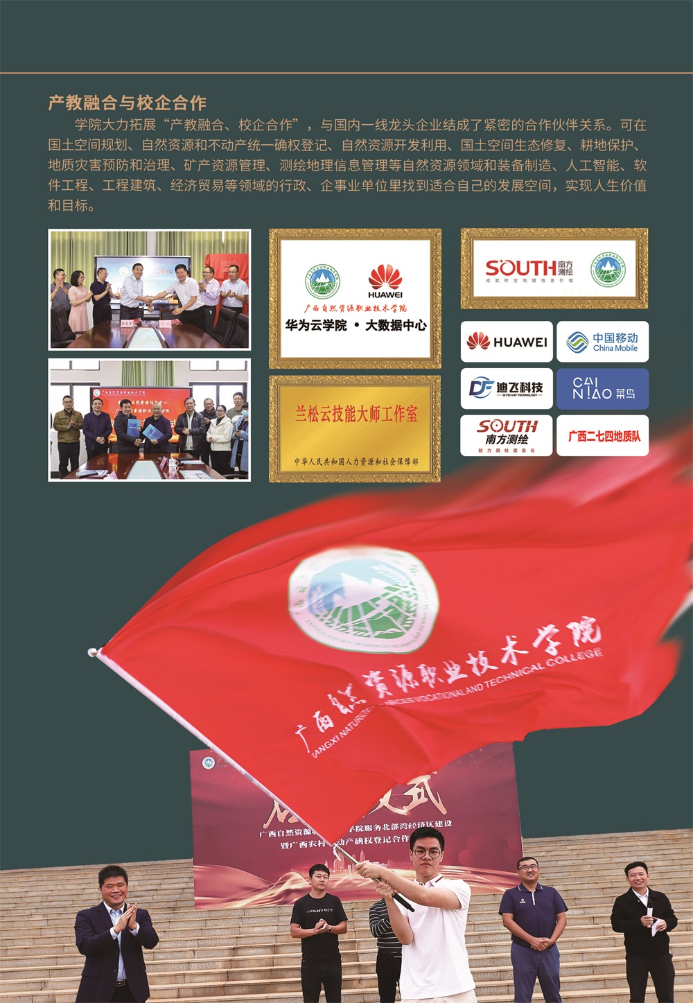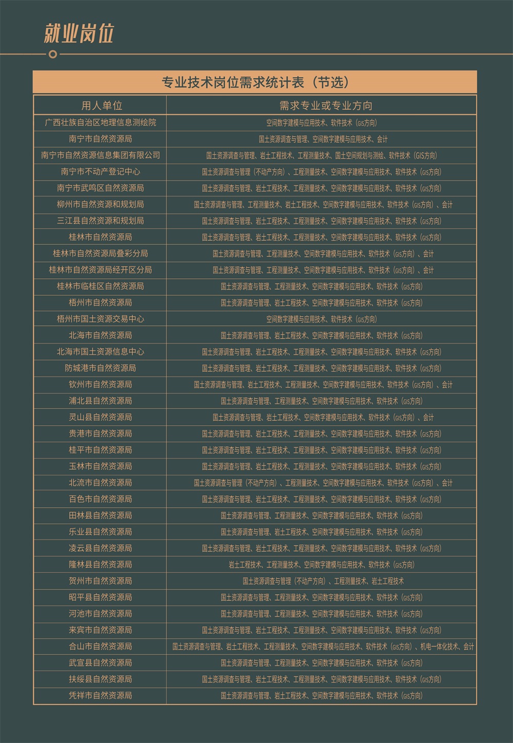 学院坚持开放办学,强化校企合作和产教深度融合,与区内外行政管理部门和知名企事业单位建立了人才输送的合作关系。学生毕业可在国土空间规划、自然资源和不动产统一确权登记、自然资源开发利用、国土空间生态修复、耕地保护、地质灾害预防和治理、矿产资源管理、测绘地理信息管理等自然资源领域和装备制造、人工智能、软件工程、工程建筑、经济贸易等领域的行政、企事业单位里找到适合自己的发展空间,实现人生价值和目标,更好地为广西自然资源行业和社会经济发展建功立业,成就出彩人生。