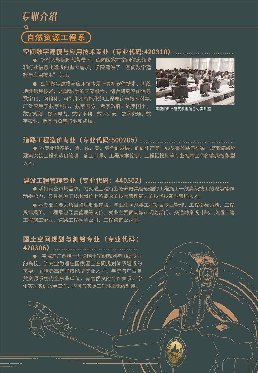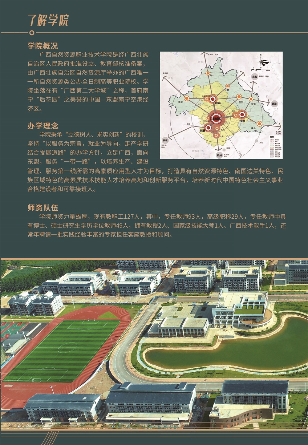 广西自然资源职业技术学院是经广西壮族自治区人民政府批准设立、教育部核准备案,由广西壮族自治区自然资源厅举办的广西唯一一所自然资源类公办全日制高等职业院校。学院坐落在有“广西第二大学城”之称,首府南宁“后花园”之美誉的中国—东盟南宁空港经济区。